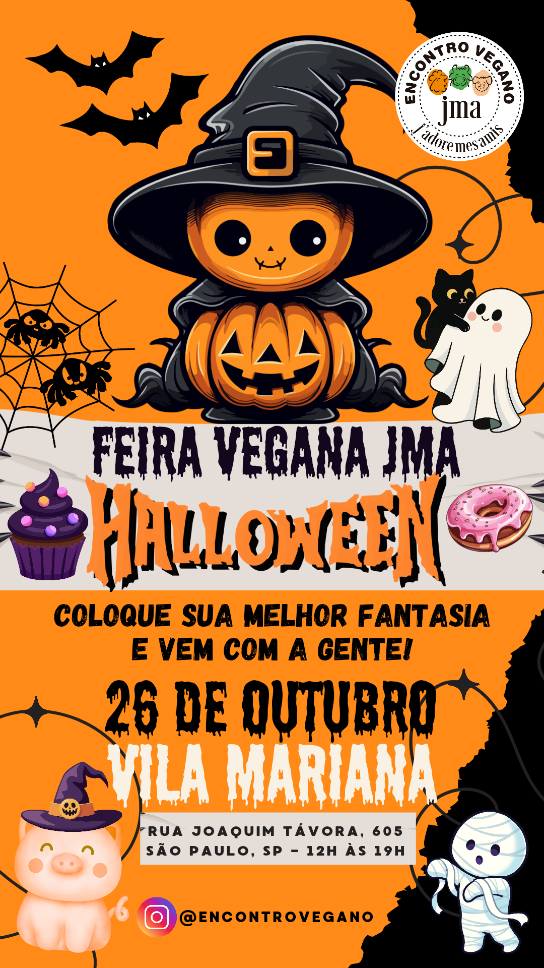 No dia 26 de outubro (domingo), o Encontro Vegano promove a Feira Vegana JMA, edição especial de Halloween. O evento ocorre com entrada gratuita, na Rua Joaquim Távora, 605, Vila Mariana, das 12h às 19h. Nesta edição, os visitantes e expositores podem participar com fantasias criativas e trajes que combinem com o tema "Gostosuras ou Travessuras".